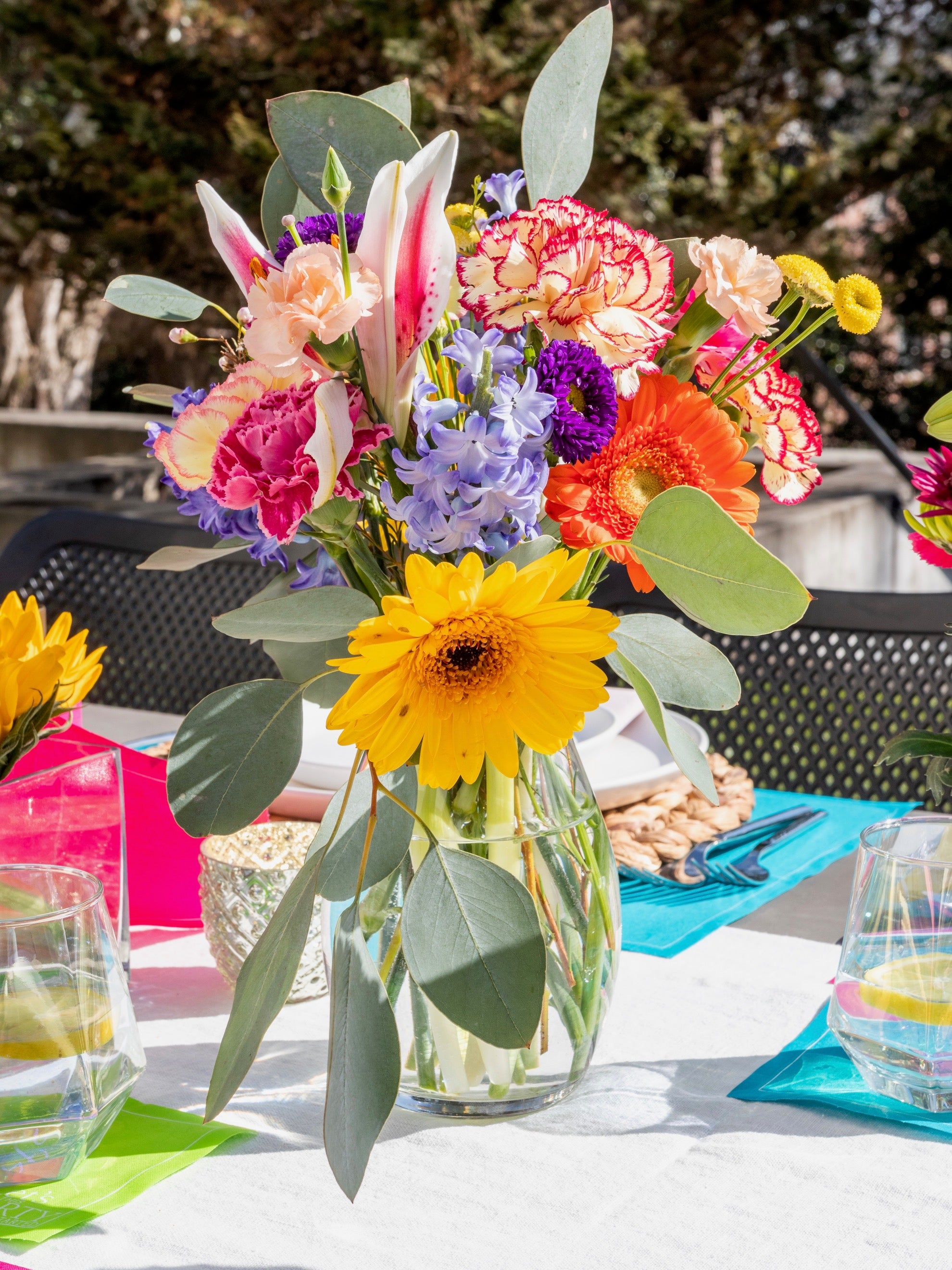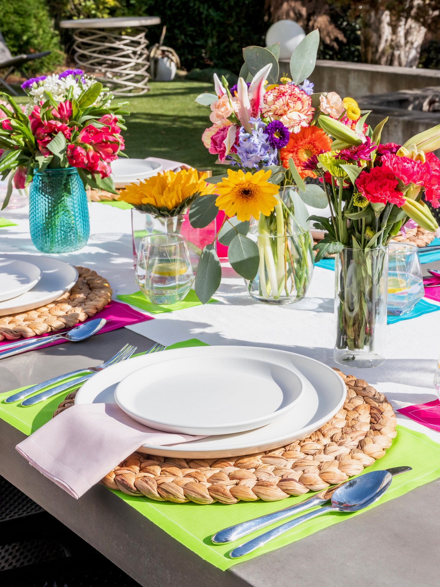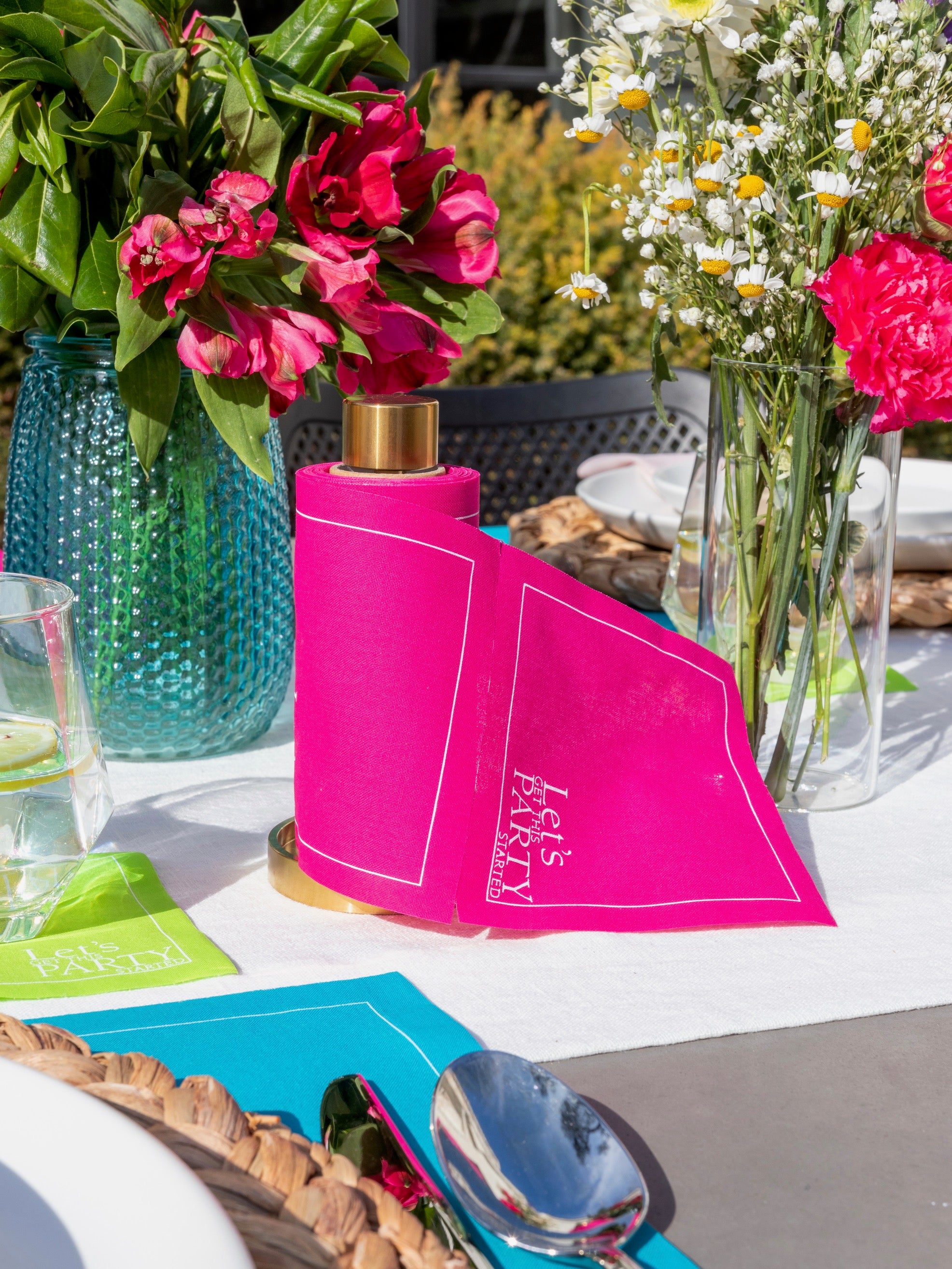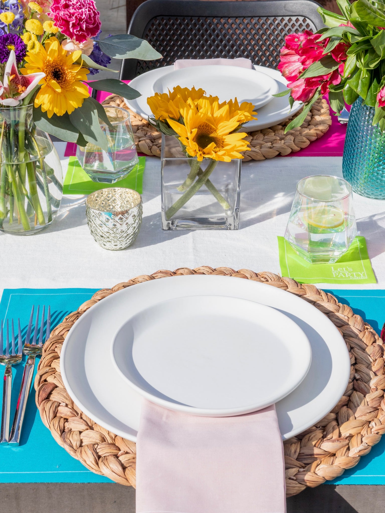 Celebrate the vibrance of spring with our Flower Power Tablescape, designed to bring playful color and fresh energy to your table. Featuring a mix of Blush Crush (fuchsia), Margarita Madness (lime green), and Real Teal placemats for a dynamic and lively foundation, paired with Light Crush (soft pink) dinner napkins for a delicate contrast, and completed with a trio of Blush Crush, Margarita Madness, and Real Teal cocktail napkins for a perfectly coordinated pop of color, this tablescape captures the essence of springtime joy.