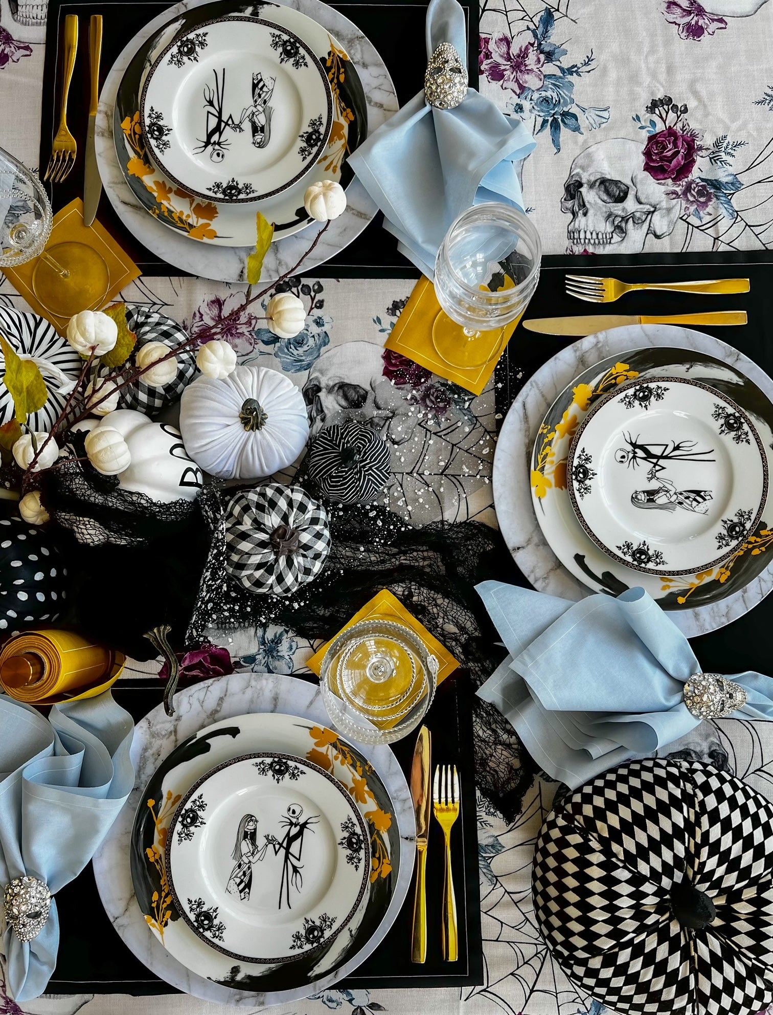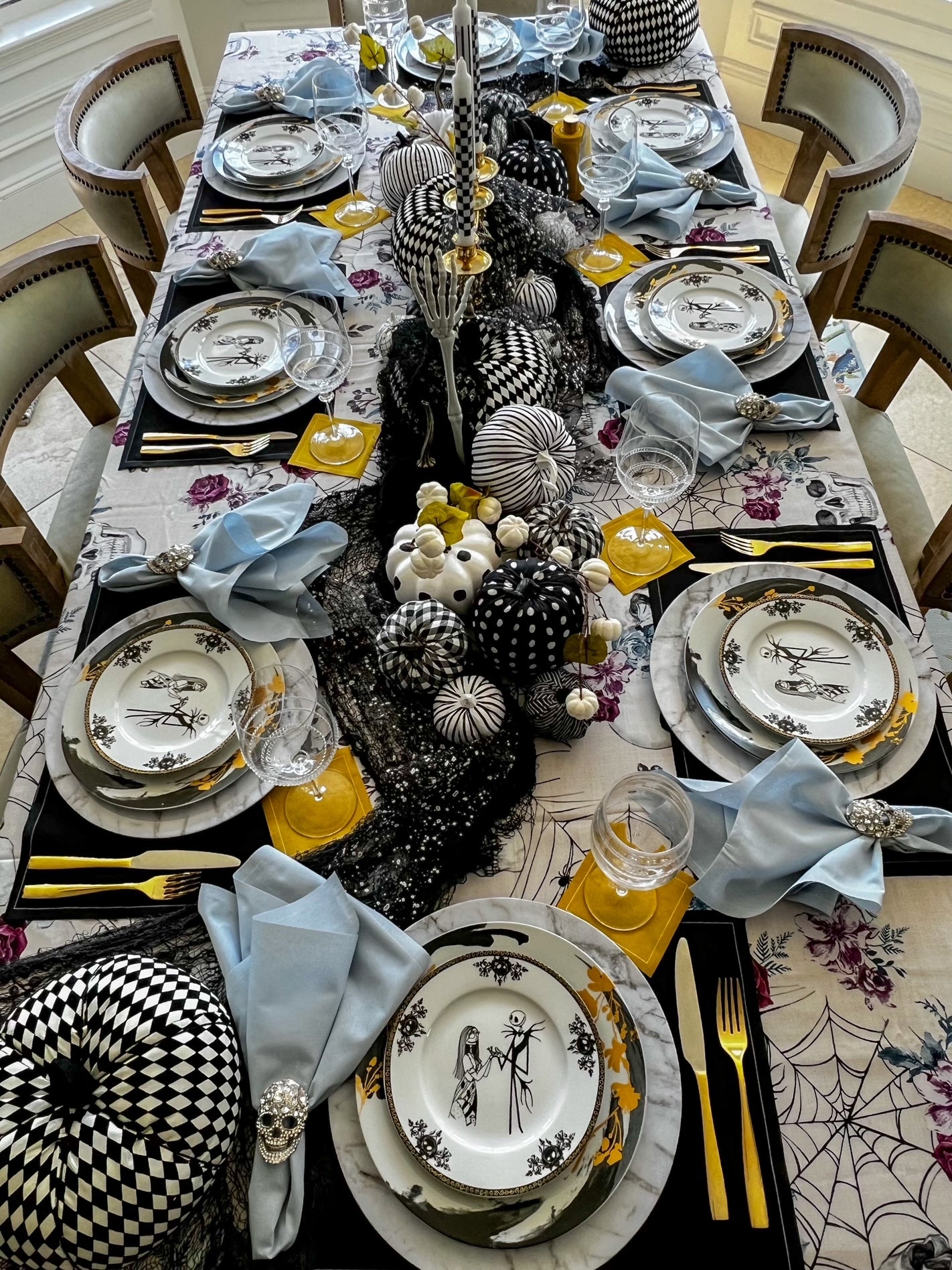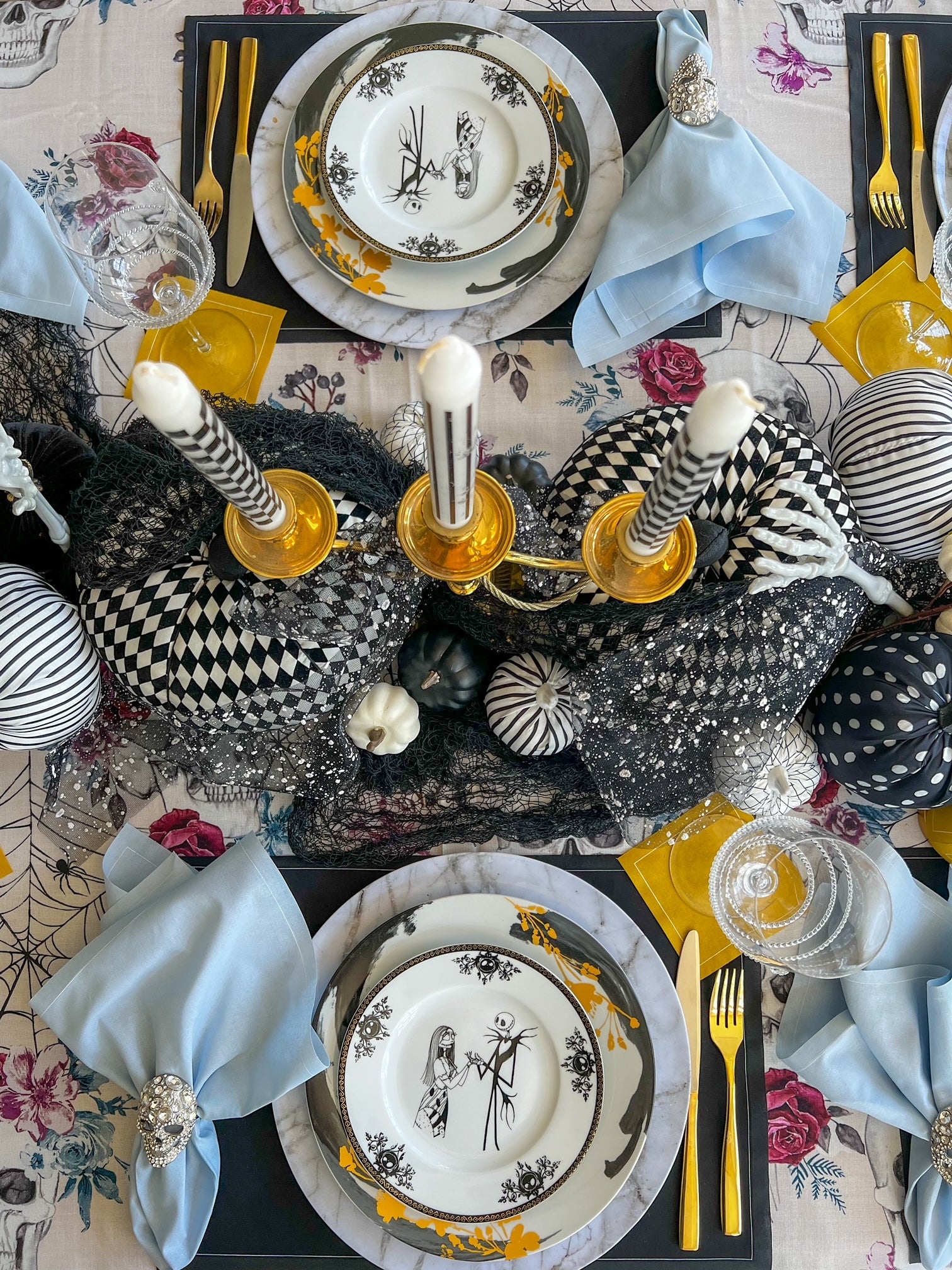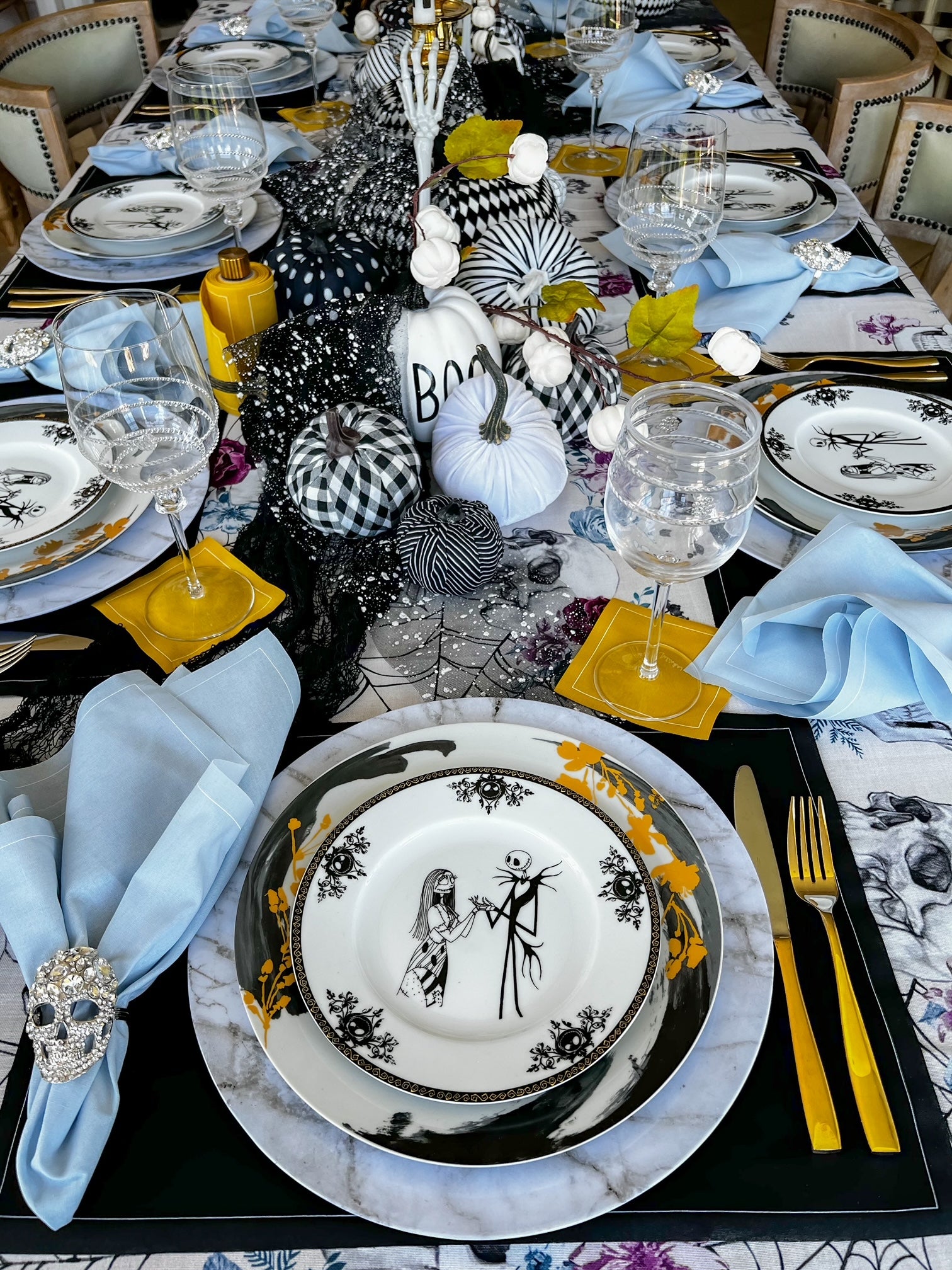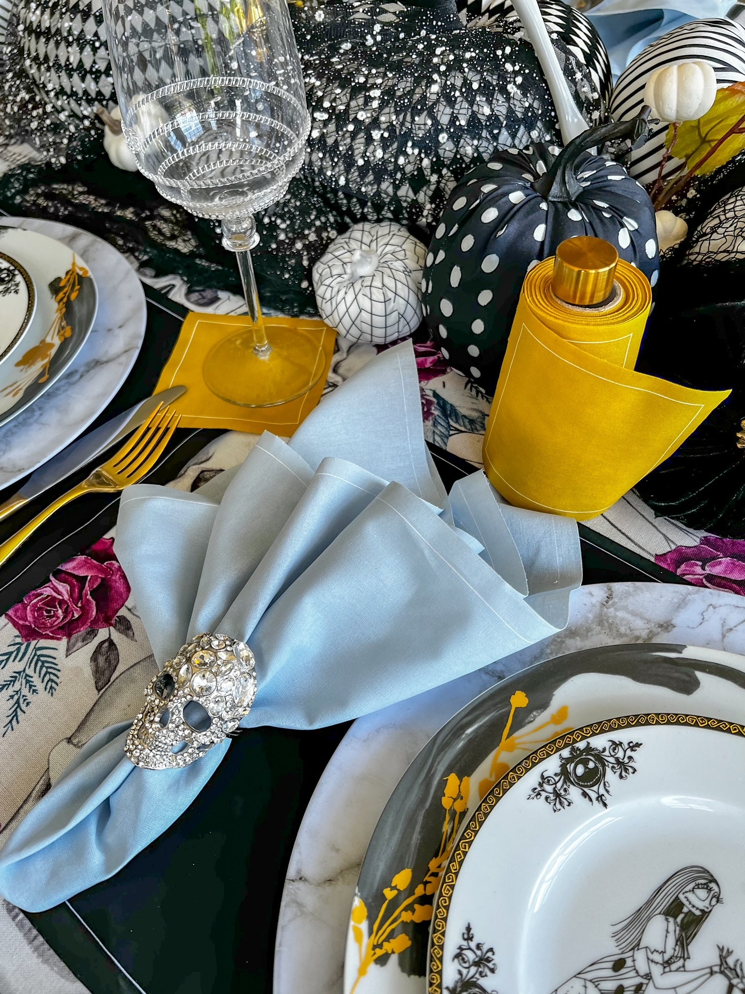Step into a world where dramatic elegance and festive flair collide with our The Haunting Before Christmas Tablescape. Designed for those who crave a sophisticated take on Halloween, this tablescape brings together bold contrasts and luxurious accents. Our Queen of Spades (black) placemats provide a rich, dramatic base, paired with Glass Slipper (light blue) dinner napkins for a cool, unexpected twist. Tying it all together, our gold cocktail napkins offer a hint of holiday glow, making this tablescape a showstopper.